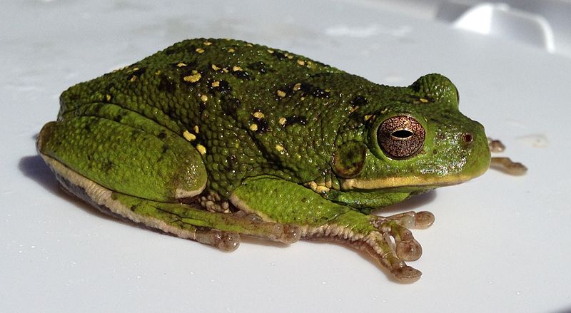 Floridas green spotted frog specie. Many persons compare the barking tree frog sound to the barking of a pack of dogs. Is a spotted arborial frog species.